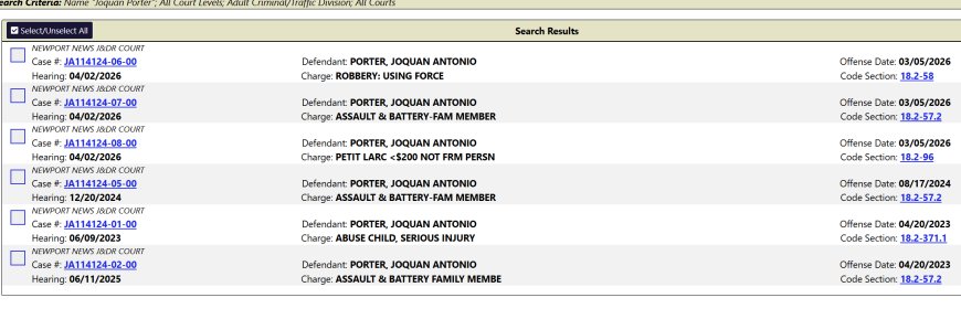 Joquan Antonio Porter, 39, is wanted by the Newport News Police Department for first-degree murder (and related firearm charges) in the shooting death of his wife, Keshia Pearley, on April 1, 2026. He is considered armed and dangerous.