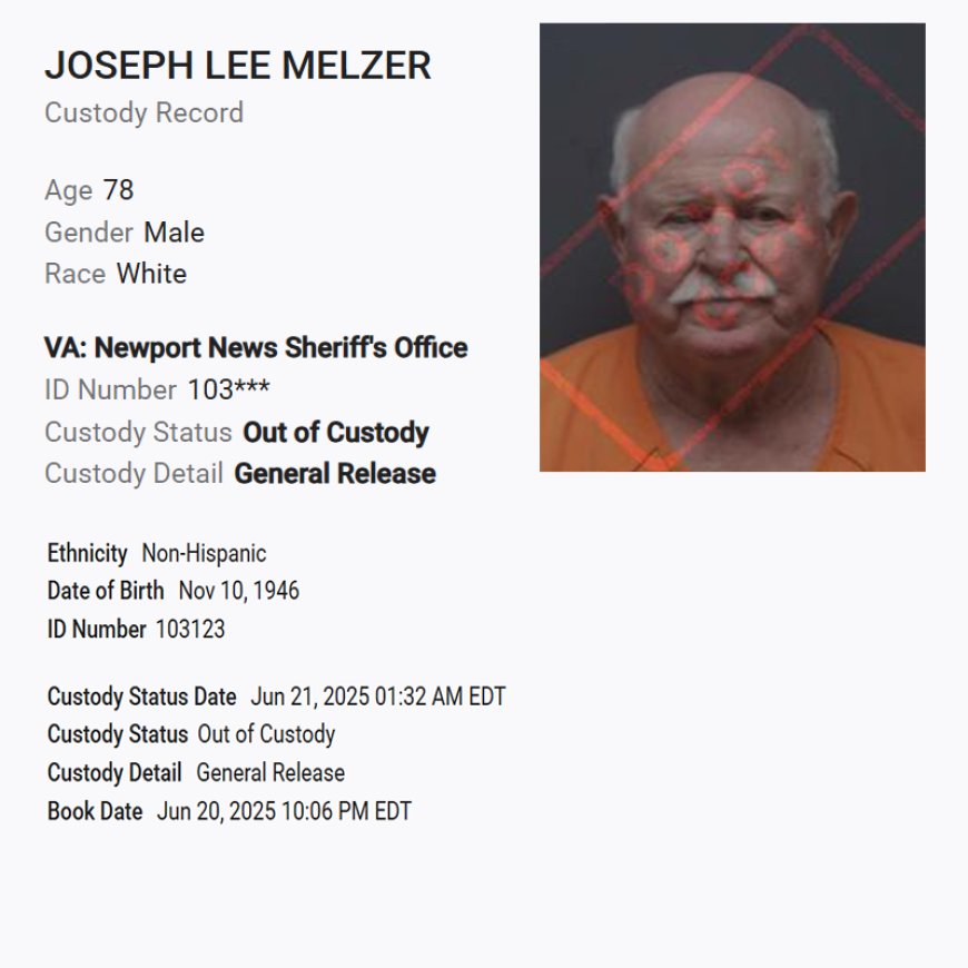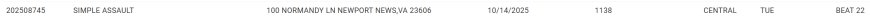 | 2025003775 | 06/20/2025 | 18:42 | 100 NORMANDY LN NN, 23606 | ASSAULT: (MISDEMEANOR) | MELZER, JOSEPH L. | 5ft 10in | 200 lbs | W | M | 78 | CENTRAL | S.N. DANIEL |