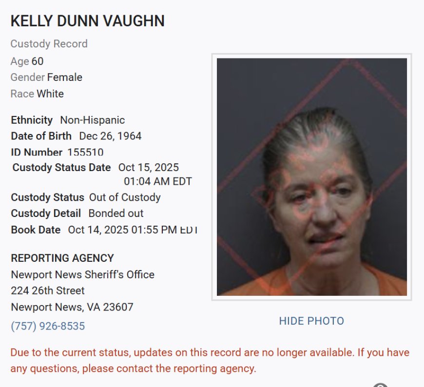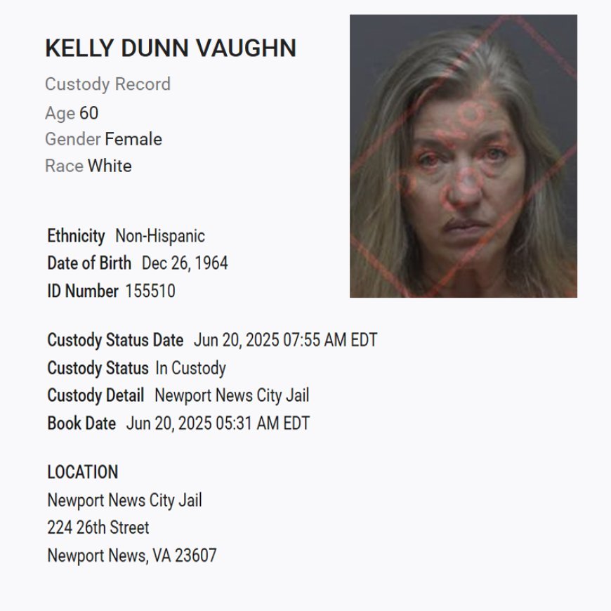 60 year old Kelly Vaughn of Newport News was arrested Friday on charges of abduction by force, intimidation or deception. Kelly is no stranger to the jail she's currently being held at as she has several previous charges ranging from DWI and reckless driving in the 1990's up to 2024 where she was charged with assault & battery, pick pocketing and various other crimes.