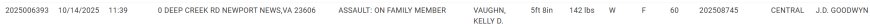 | 2025003762 | 06/20/2025 | 02:55 | 100 NORMANDY LN NN, 23606 | ABDUCTION: BY FORCE, INTIMIDATION OR DECEPTION | VAUGHN, KELLY D. | 5ft 8in | 142 lbs | W | F | 60 | 202505269 | CENTRAL | E.J. BOWERS |