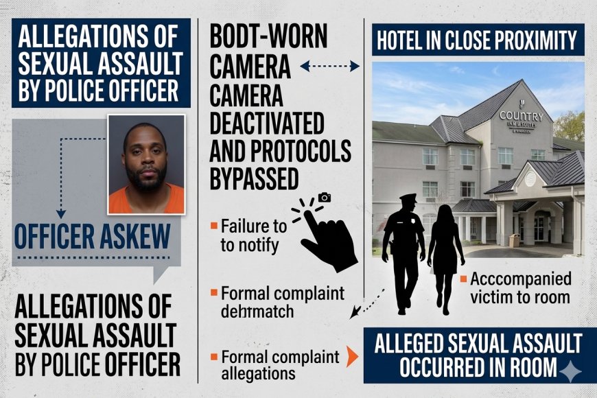 Investigators say officers learned the woman was staying at the Country Inn & Suites, located about a half-mile away on the same roadway. One officer reportedly left the scene, while Askew was assigned to provide the woman a courtesy ride back to her hotel.