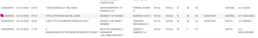 UPDATE 2/15/2026 6:30 AM EST Still no official word has been released regarding the arrest of Elvis Barrow or the victim's identity, which arrest records show occurred at police headquarters on Jefferson Avenue at 09:15 AM. Barrow was then apparently transported to the jail and booked at 11:28 AM—roughly 12 hours after the murder at the Motel 6 797 J Clyde Morris Blvd. There has been very little media coverage on this incident (see note below)