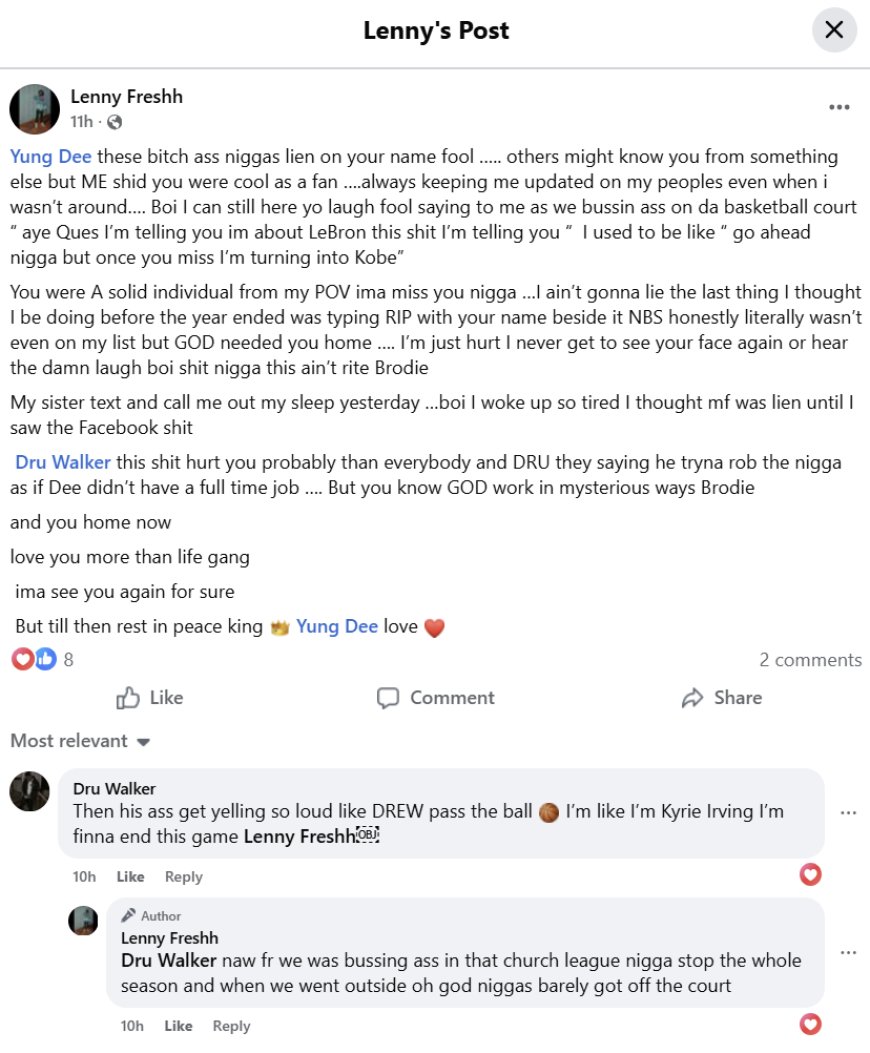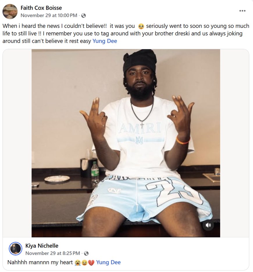 Yung Dee was also a digital creator and had posted some of his work on his Facebook page. A previous student at Woodside High School in the north section of the city, Yung Dee was a huge football fan and deeply devoted to his friends and family.