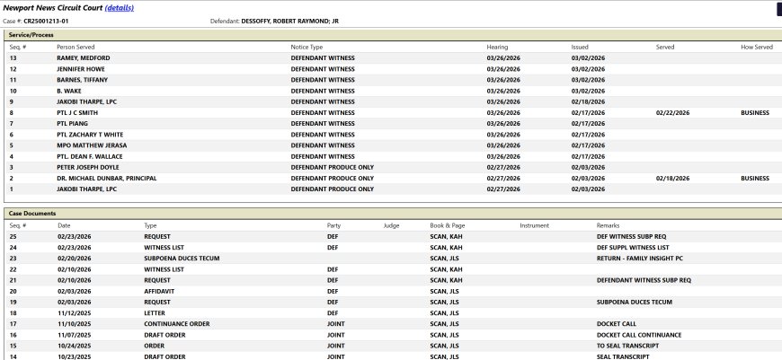 5/12/25 8 AM EST Court docs have posted , 4 felony charges against Robert Dessoffy visit https://eapps.courts.state.va.us/ocis/search search for "DESSOFFY, ROBERT"