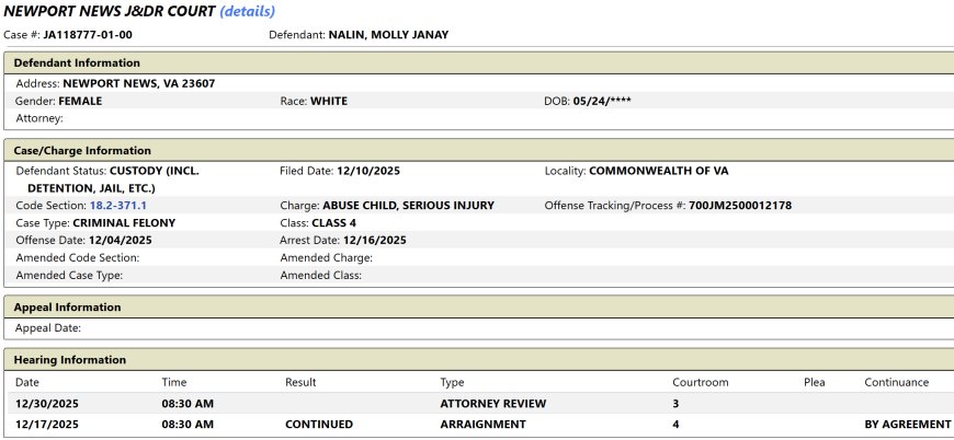Molly Nalin was booked into the Newport News City Jail on Child Abuse/Neglect charges late Wednesday evening.