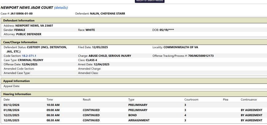 Molly & Cheyenne Nalin were both booked into the Newport News City Jail on Child Abuse/Neglect charges after an incident involving the couples young child. Molly has since been released however Cheyenne Nalin remains in custody at the Newport News City Jail