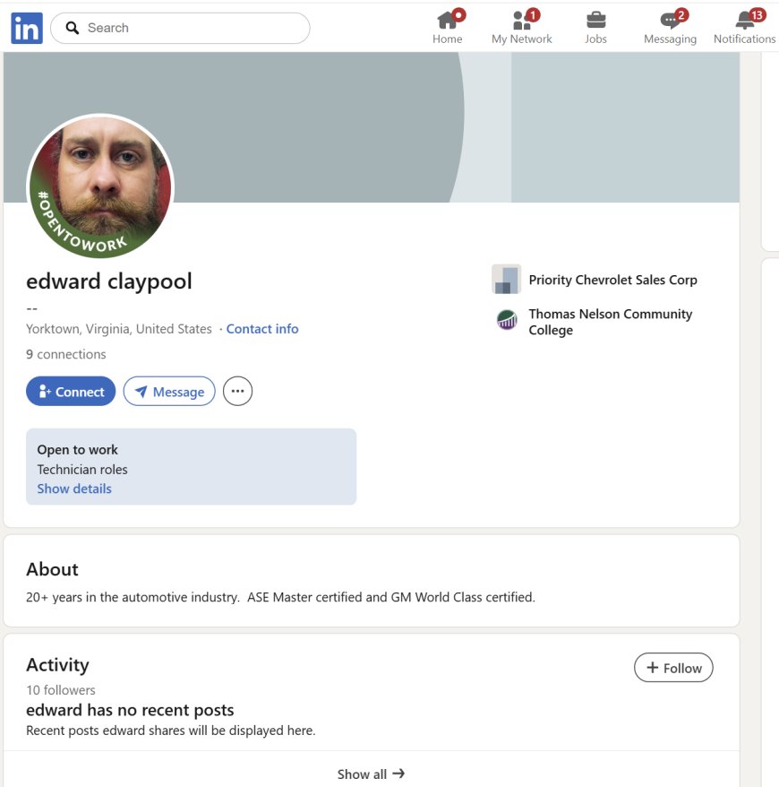 Claypool is currently employed at Southern Chevrolet on Jefferson Avenue in Newport News acording to this Linked In page and this Facebook profile page . Claypool has two high school age daughters