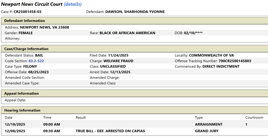 Welfare "Queen" BUSTED! Sharhonda Dawson of Newport News ARRESTED for Welfare Fraud